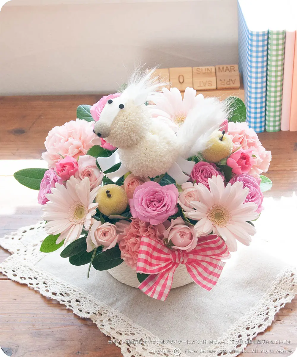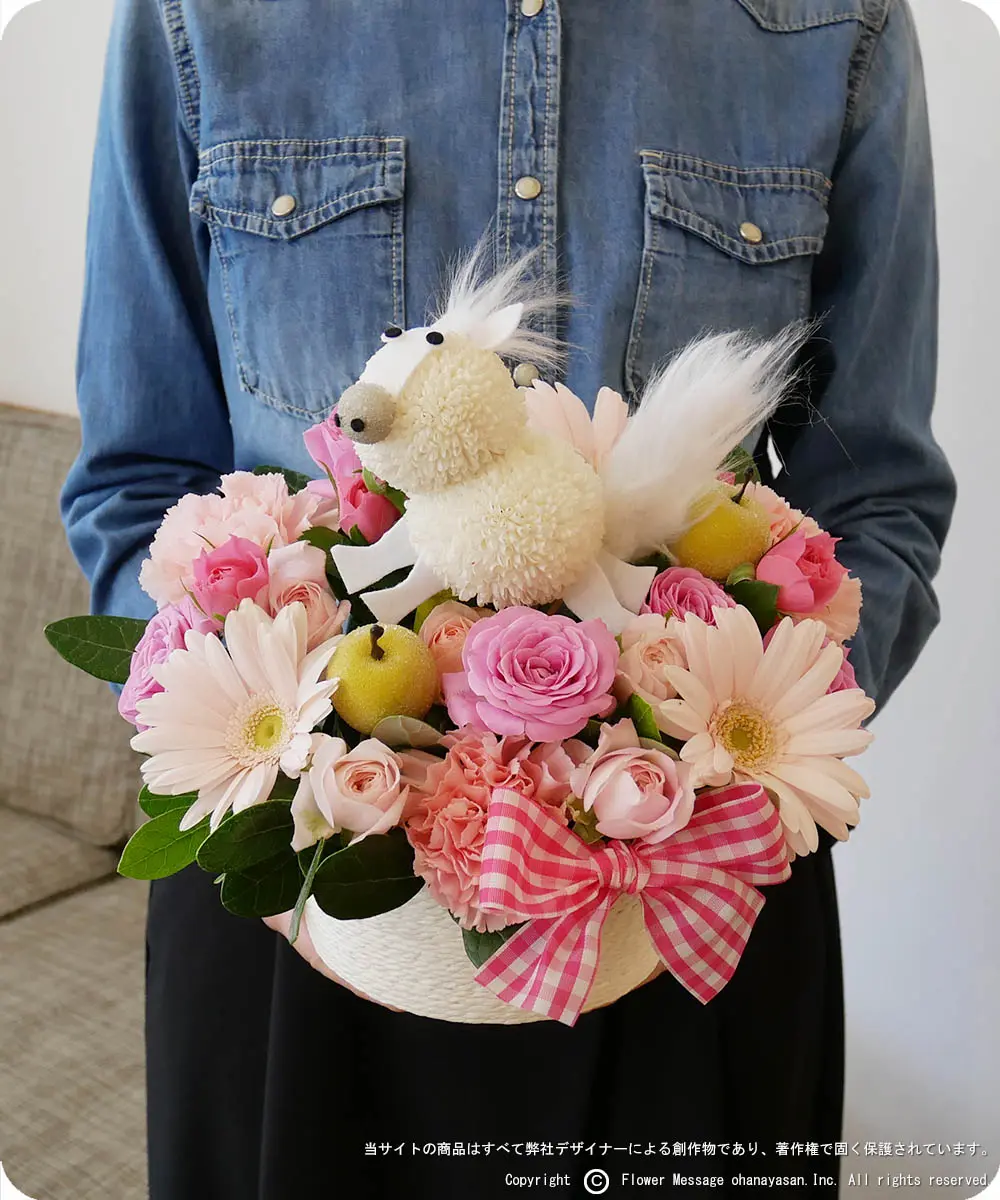(北海道・九州へのお届けは、送料+550円加算されます) サイズ :幅 約20cm、奥行き 約18cm、高さ 約21cm 白い仔馬のフラワーアレンジ(生花)。