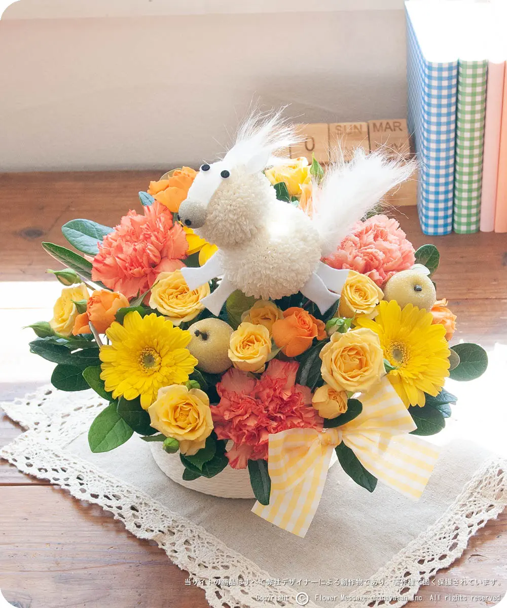 (北海道・九州へのお届けは、送料+550円加算されます) サイズ :幅 約20cm、奥行き 約18cm、高さ 約21cm 白い仔馬のフラワーアレンジ(生花)。